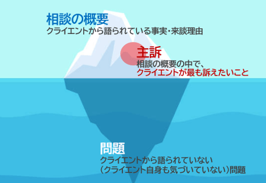 クライエント目線の問題は主に氷山の上の部分、相談の概要や主訴を指し、キャリアコンサルタント目線の問題は氷山の下に見立てたものです。