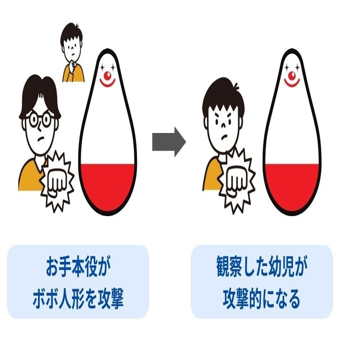 大人がボボ人形に対して攻撃を加える映像を見せられた子供はそうでない子供に比較して明確に攻撃性を示すことが知られています。